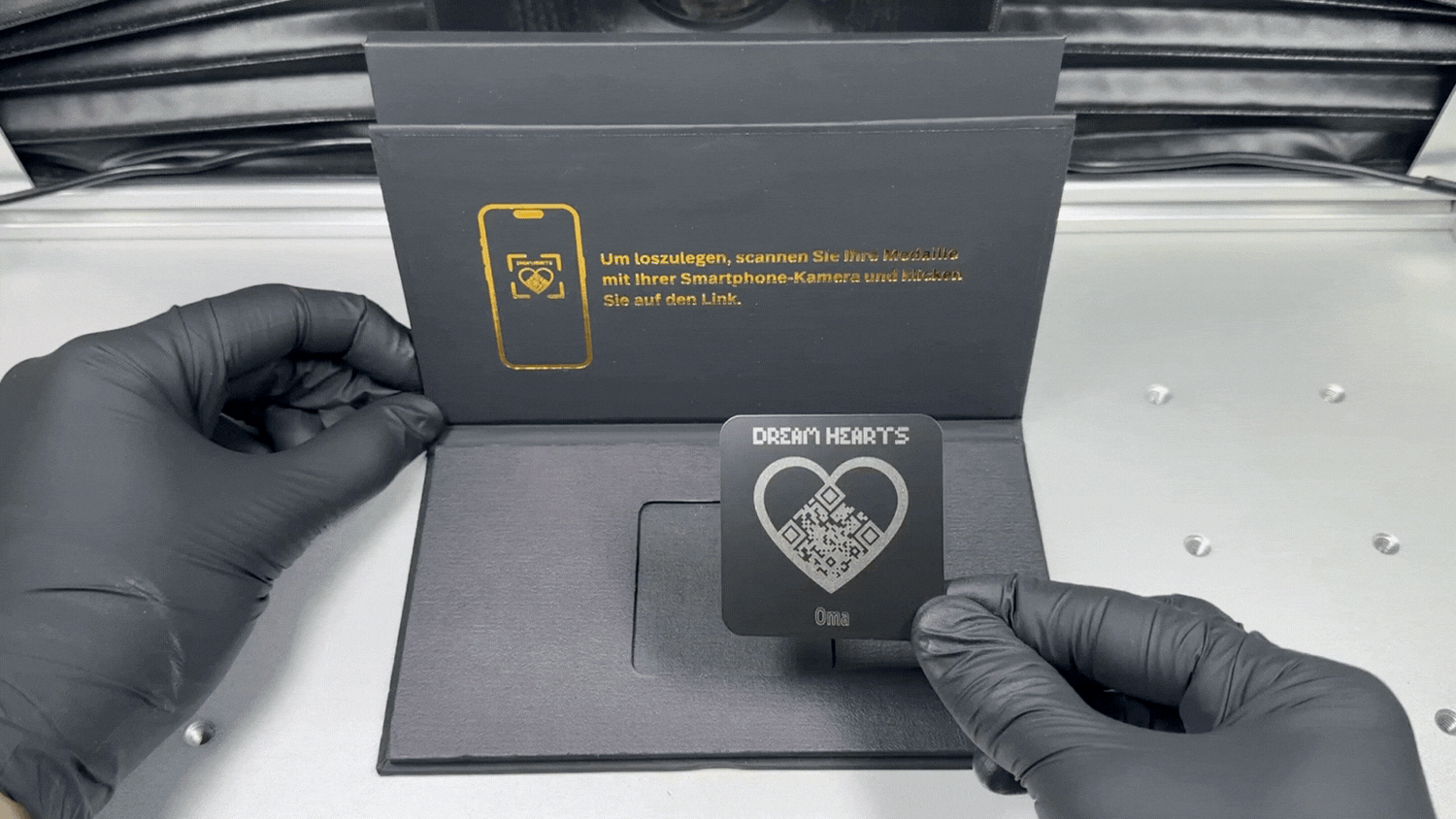 Wenn du eine DREAM HEARTS Medaille kaufst, erhältst du eine Medaille mit einem eingravierten QR-Code, der mit deinem Profil verbunden ist.