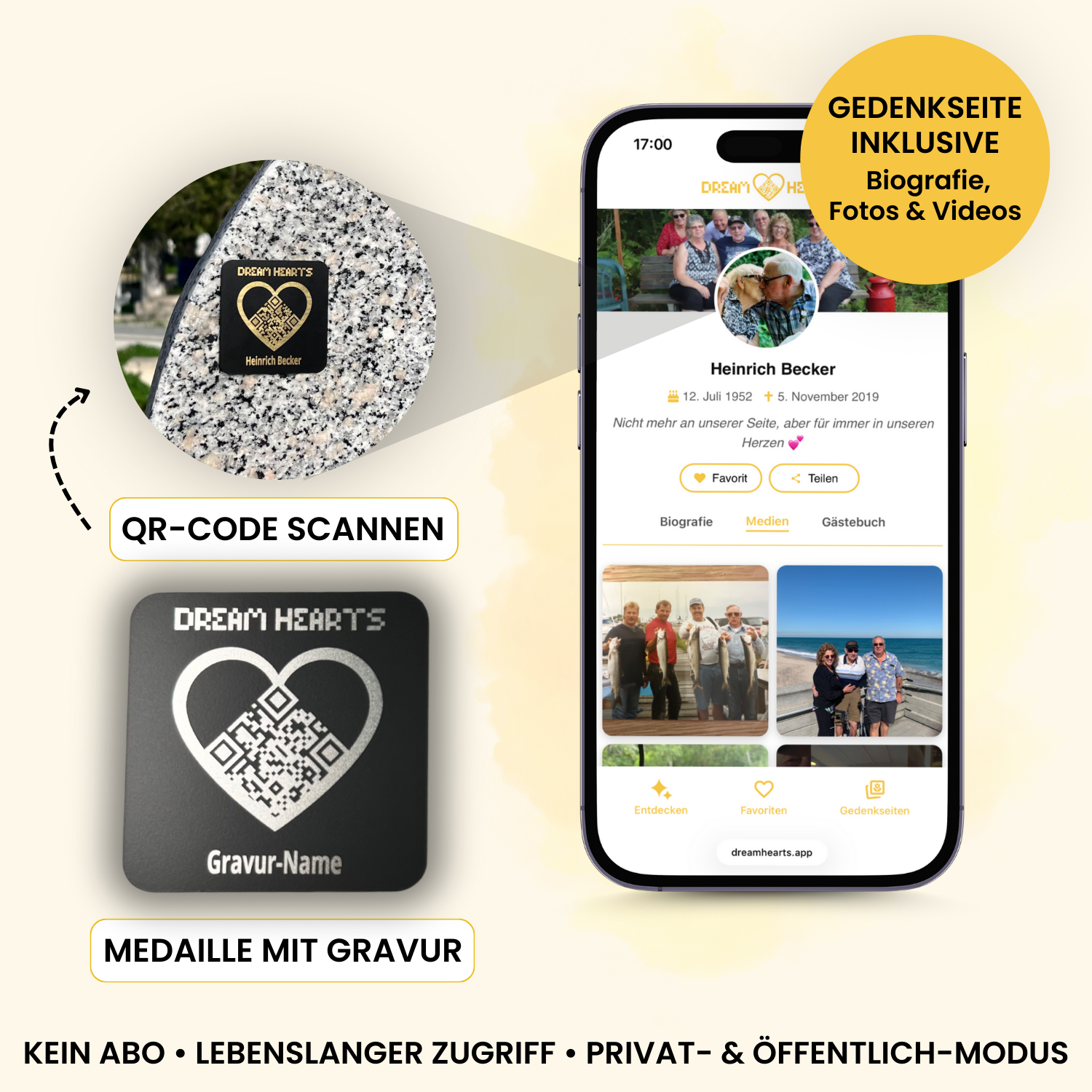 Die DREAM HEARTS Medaille ist eine personalisierte Medaille mit QR-Code, die mit deiner eigenen Gedenkseite verlinkt ist, um Erinnerungen zu bewahren.